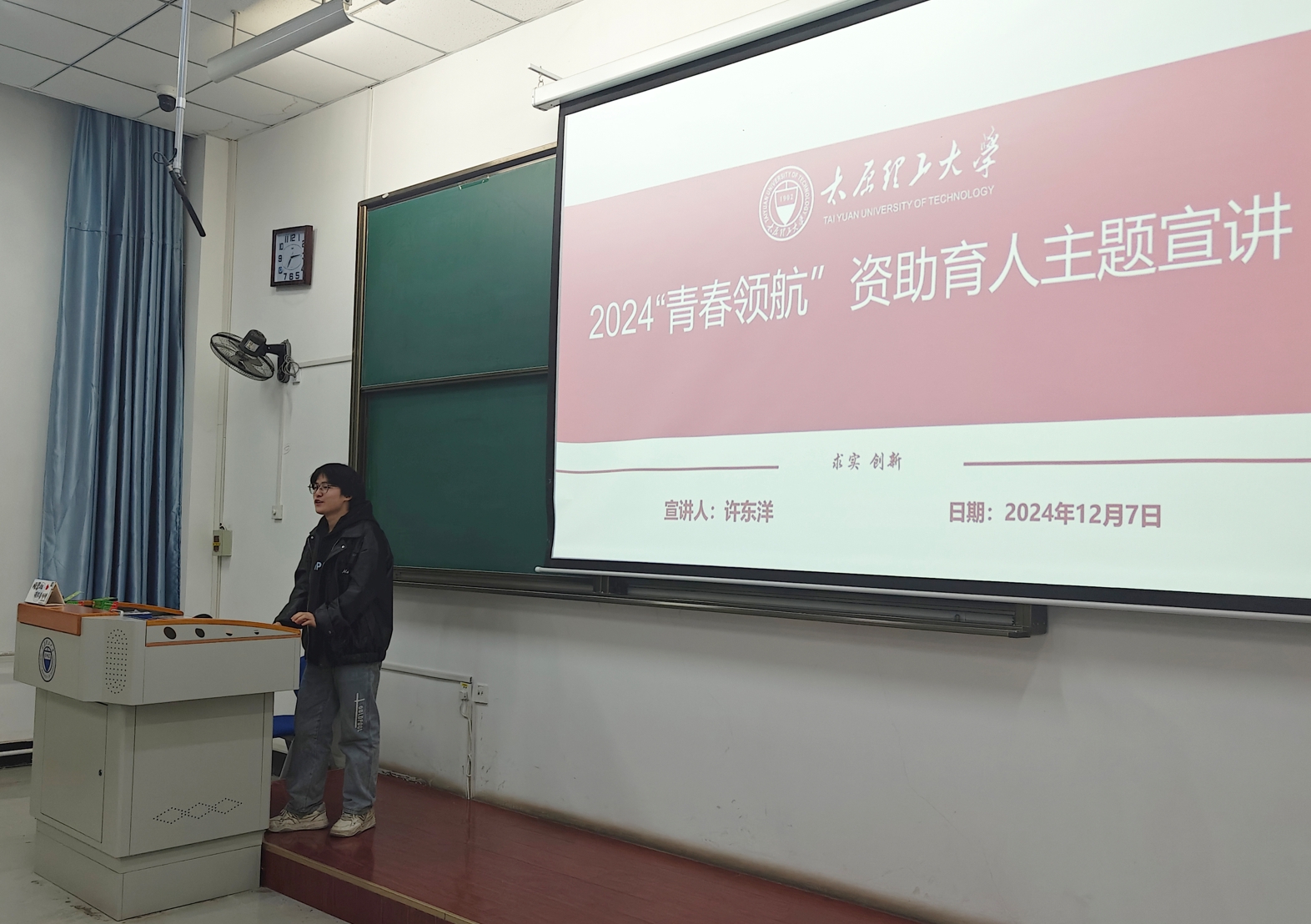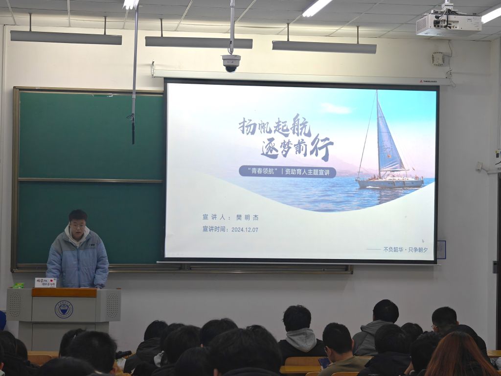 12月7日晚7:00,永利3044集团官网在行远楼B123教室开展了2024“青春领航”资助育人主题宣讲活动。宣讲活动邀请了国家奖学金获得者樊明杰、科技创新类推免生赵晨瑀、国家励志奖学金、校优秀员工干部获得者许东洋、校三好员工获得者贾依晨作为主讲人。2023级全体同学参加,会议由院团委副书记许通陆主持。