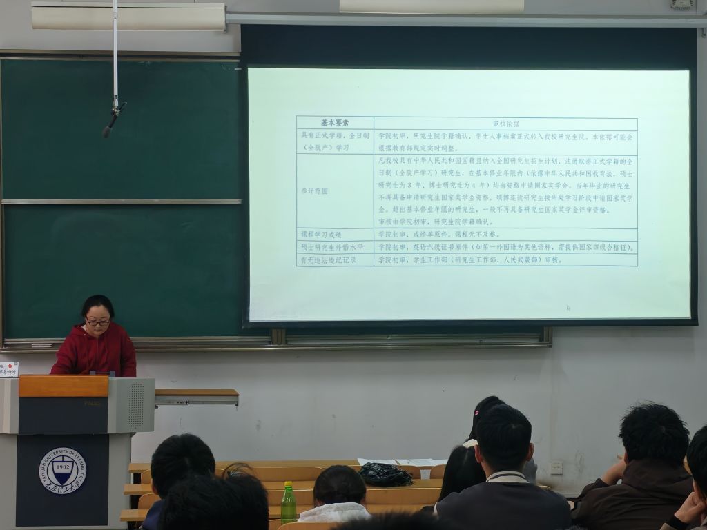 为充分发挥国家奖学金的激励导向作用,营造积极进取、潜心科研的优良学风,2025年11月6日,永利3044集团官网在行知楼B113教室成功举办了“铸魂·领航”研究生国家奖学金经验交流分享会。本次分享会邀请了2025年度研究生国家奖学金获得者王开、魏瑞鑫、李宁、周雅茹四位同学进行分享,吸引了众多研究生同学踊跃参与。