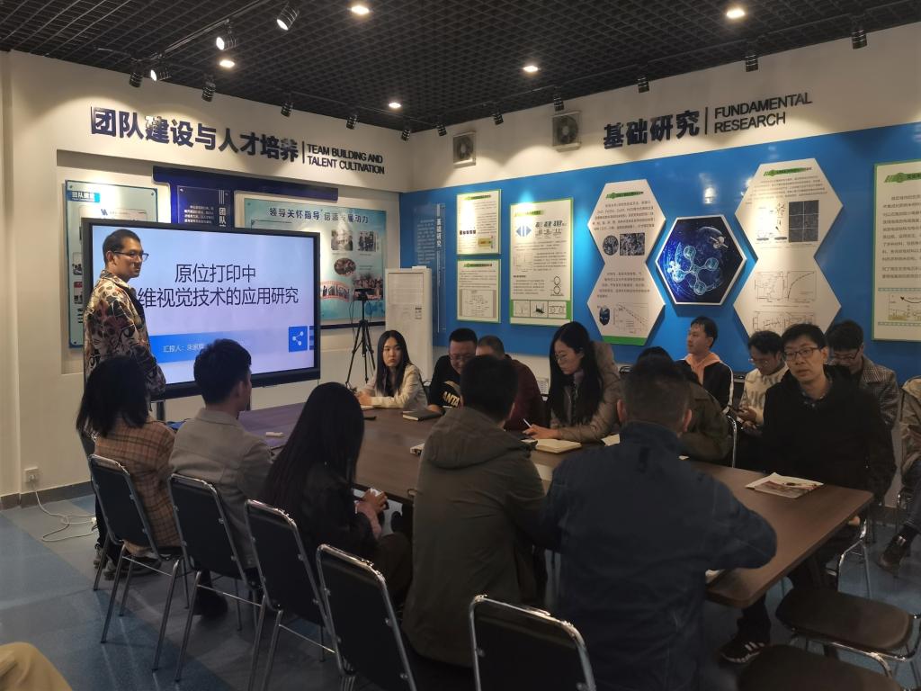 本次学术报告汇报人为朱家辉博士,汇报的内容是原位打印中三维视觉技术的应用研究。本次报告针对原位打印三维模型设计中的三个问题,即如何将现实世界物体转化为数字化的三维模型、如何分辨三维数字模型需要打印的部分(缺陷部位)以及如何确定待打印物体的组成成分,提出了相应的解决方案。在三维建模方面,利用点云生成技术获取目标三维模型,可用的技术方式包括但不限于3D扫描仪、单目视觉、双目/多目视觉以及RGB-D深度视觉等方式;在数字模型分辨方面,介绍了一种新型的3D点云分割框架——3D-BoNet,通过最小化匹配代价函数来实现大致的边界框回归,并通过点掩码预测来实现最终的实例分割;在模型成分分析方面,介绍了PointRCNN算法,直接根据点云分割的结果来产生候选框,并根据这些候选框的内部数据和之前的分割特征来完成物体的准确定位和分类出的方法。最后,朱家辉博士向在座师生阐述了实现一体化原位打印的技术路线以及当前阶段实验成果。参会师生就学术报告相关内容进行了热烈的讨论。