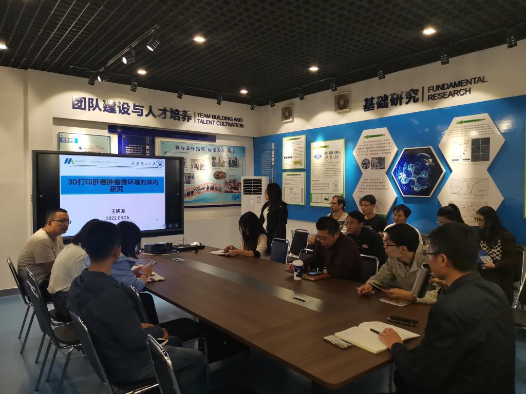 本次学术报告人为王晓圆博士,汇报的内容是3D打印肝癌肿瘤微环境的体内研究。王晓圆博士结合近期较高水平的论文,阐述了当前3D打印肝癌肿瘤微环境体内研究的最新进展。随后基于文献中体内研究的实验方法,提出所设计肿瘤的体内研究具体实验方案,表明3D肝癌肿瘤微环境模型具有较强的致瘤性。通过介绍相关领域的研究成果,帮助大家更好了解了3D打印肝癌肿瘤微环境的原理与应用价值。参会的各位老师同学就报告内容进行了热烈的讨论。
