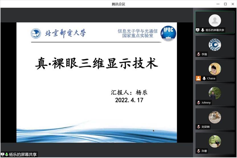 本次学术报告汇报人为杨乐老师,汇报的内容是裸眼三维显示技术的研究。杨乐老师首先介绍了裸眼三维显示技术的原理和应用领域,并概述了目前裸眼三维显示技术存在的关键问题。然后,结合研究经历介绍了提升裸眼三维显示视点数目、分辨率与扩大视角的三种有效方法,分别为设计微针孔单元阵列,并结合光线追迹编码算法实现对视点数目的提升;提出光场采集与重构实时算法,并利用人眼跟踪设备实现了超多视点、高分辨率、大视角的高质量立体显示效果;设计方向性背光光源,实现了对集成成像裸眼3D显示视角与分辨率的1倍提升。最后,提出裸眼3D显示技术的发展趋势,对未来的工作进行展望,下一步计划探索利用深度学习来提升裸眼三维显示质量的方法。参会的各位老师、员工就学术报告相关内容进行了热烈的讨论。