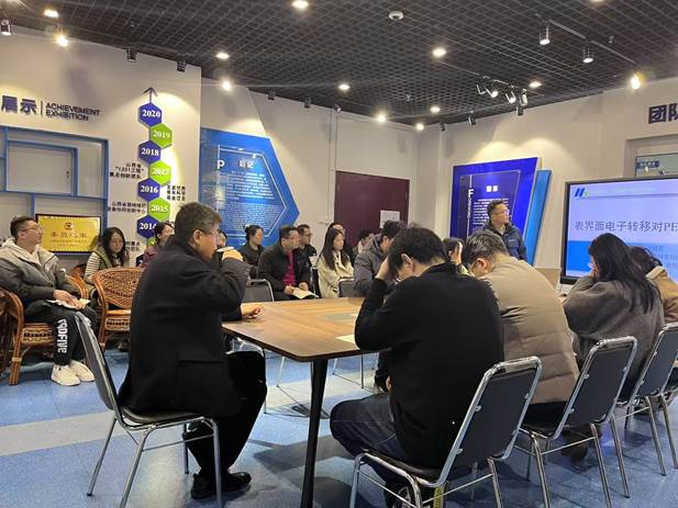 本次学术报告汇报人为张祖星博士,汇报的内容是表界面电子转移对PEC传感的影响。光电化学传感器的表界面分析依赖于异质结形成中光生电子空穴对的分离与复合,目前的研究对于其中涉及的主要表界面现象则缺少相关论证,如溶液中离子扩散,双电层的形成以及电荷转移等。本次报告介绍了DRT分析方法对表界面研究的重要性,并介绍了采用DRT分析方法检测目标物质时的界面分布情况的相关文献。最后通过实验论证了在BiVO4上修饰CQDs后,出现明显的表界面现象,表明了DRT分析方法对光电化学传感器表界面分析的可行性。参会的各位老师员工就学术报告相关内容进行了热烈的讨论。